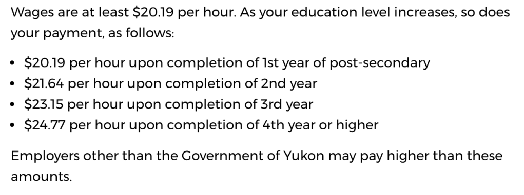 The Yukon Government employs student employees from Yukon through it’s STEP program, which has a starting wage of $20.19. Here is a chart showing annual increases: