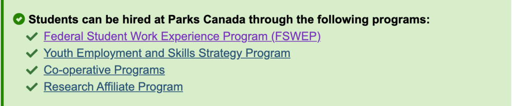 Similarly, the Museum is disadvantaged compared to Parks Canada in a wage competition for students across Canada. While I was unable to find a specific job post for comparison, some Parks Canada jobs are through the Federal Student Work Experience Program (FSWEP).
