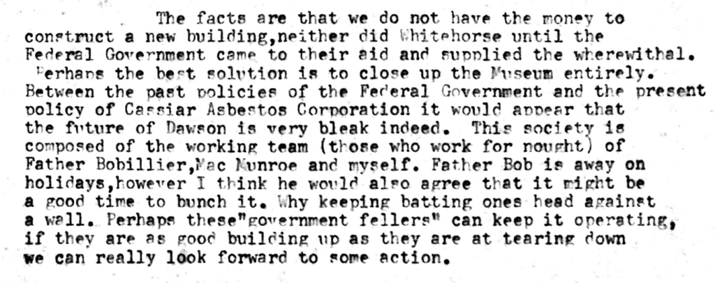 Importantly, the Minister in question represented the Klondike – that is, the Dawson City Museum’s jurisdiction. And, as stated above, the Dawson City Museum was very much against centralization, which they feared would re-direct support away from museums outside of Whitehorse.