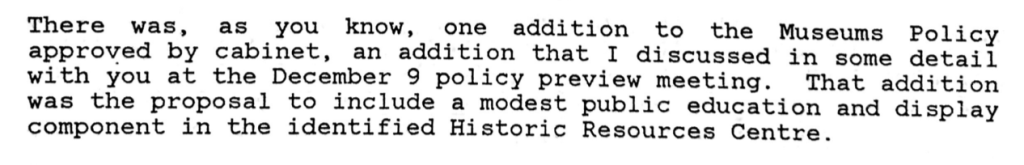 I am looking at the Minister of Tourism’s response to advocacy against exhibitions within a territorial Historic Resources Centre in 1989. Here are some excerpts from the letter, which I find most salient:
