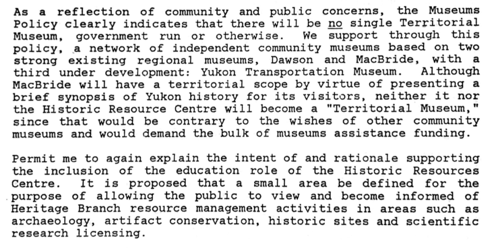 I find this letter interesting because it demonstrates that, like the Dawson City Museum, the Yukon Historical and Museums Association (YHMA) was arguing against the development of a territorial museum or related institution in the late 1980s.