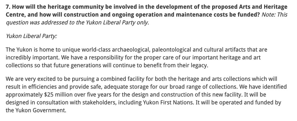 The advocacy’s relevance is most apparent when compared to the YHMA’s reaction to a contemporary proposal for a Heritage Center. The re-elected Liberal’s promised a centralized Centre for “maintaining, conserving, exhibiting and interpreting” the Yukon’s collection as part of their election campaign (source).